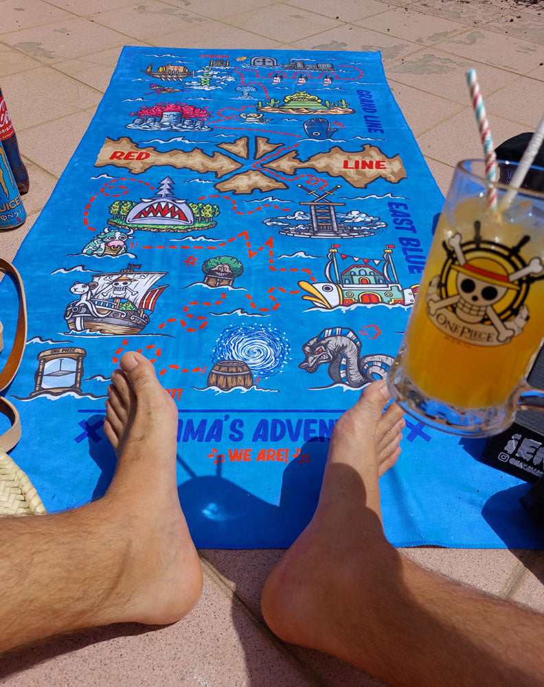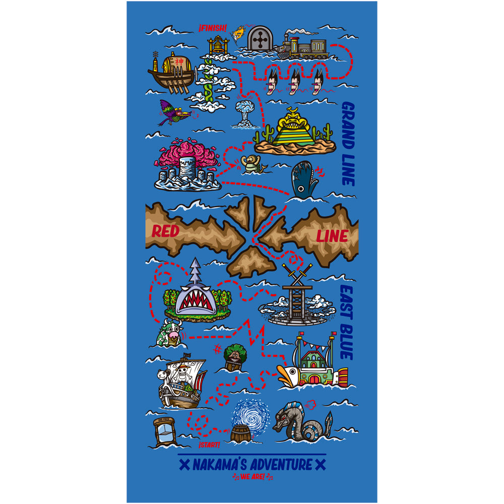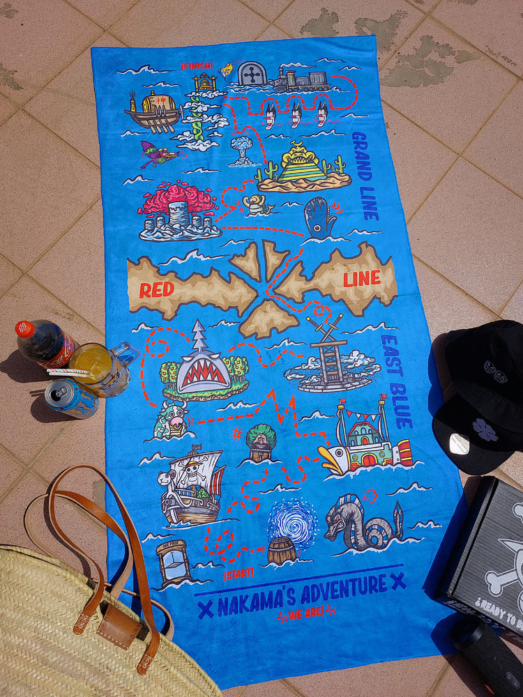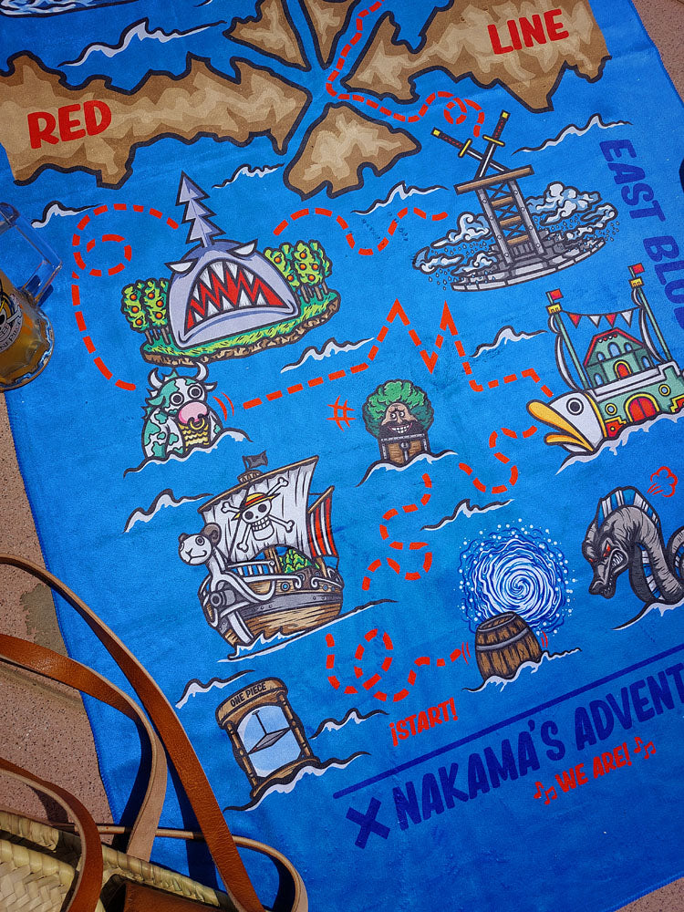 Bon Voyage towel from the anime brand Nakama Clothing. The map to find the legendary treasure, left by that man somewhere in this ocean.