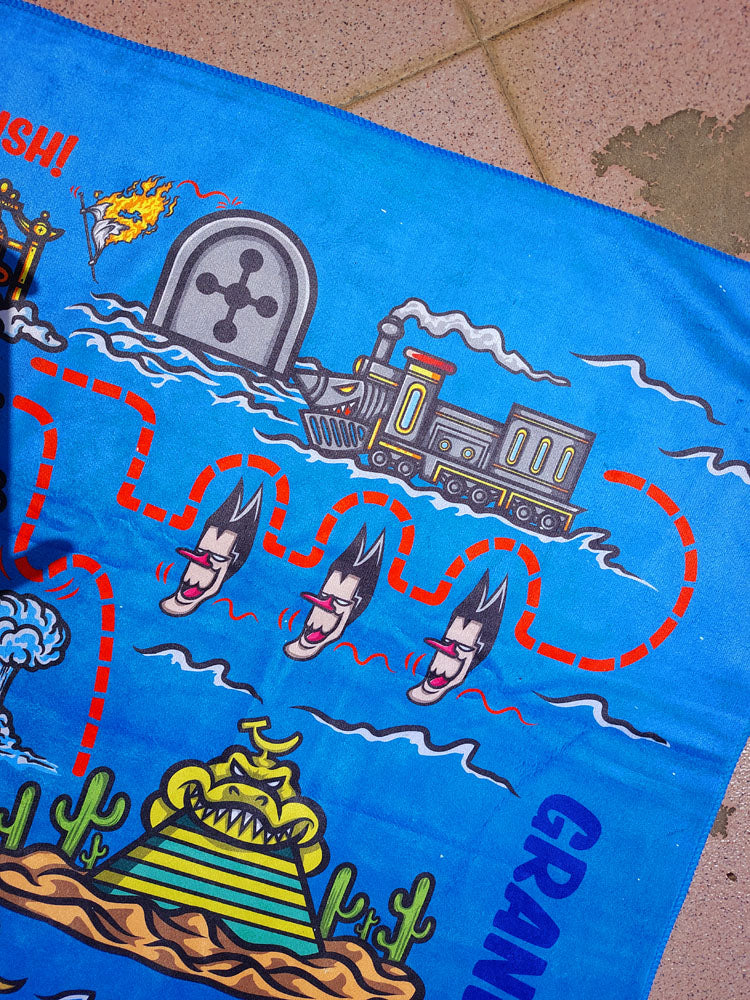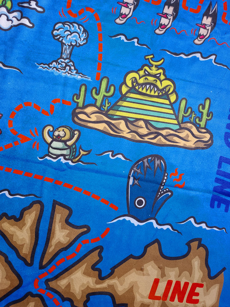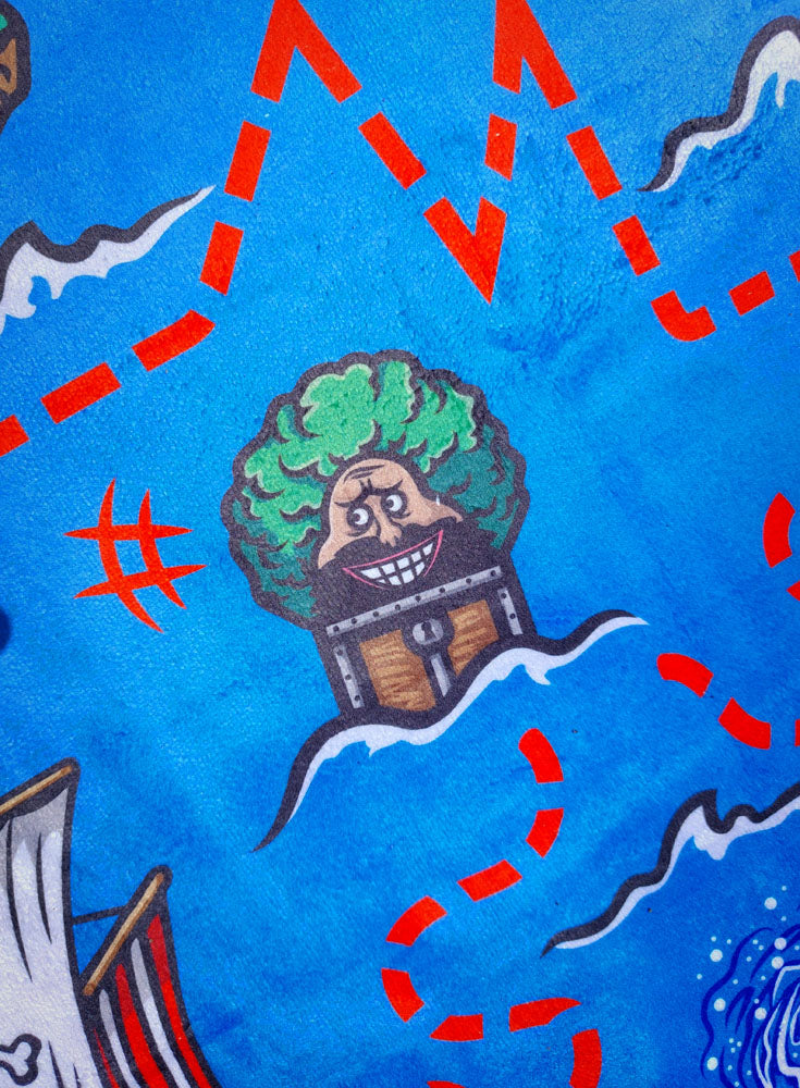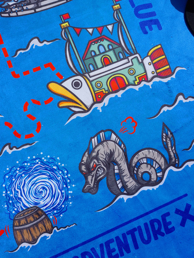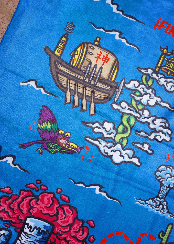 Bon Voyage towel from the anime brand Nakama Clothing. The map to find the legendary treasure, left by that man somewhere in this ocean.